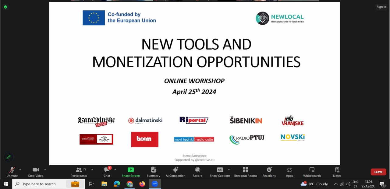 As a part of the project, the consortium organized an Online workshop with the title "New tools and monetization opportunities", that was held on April 25th 2024, via Zoom.